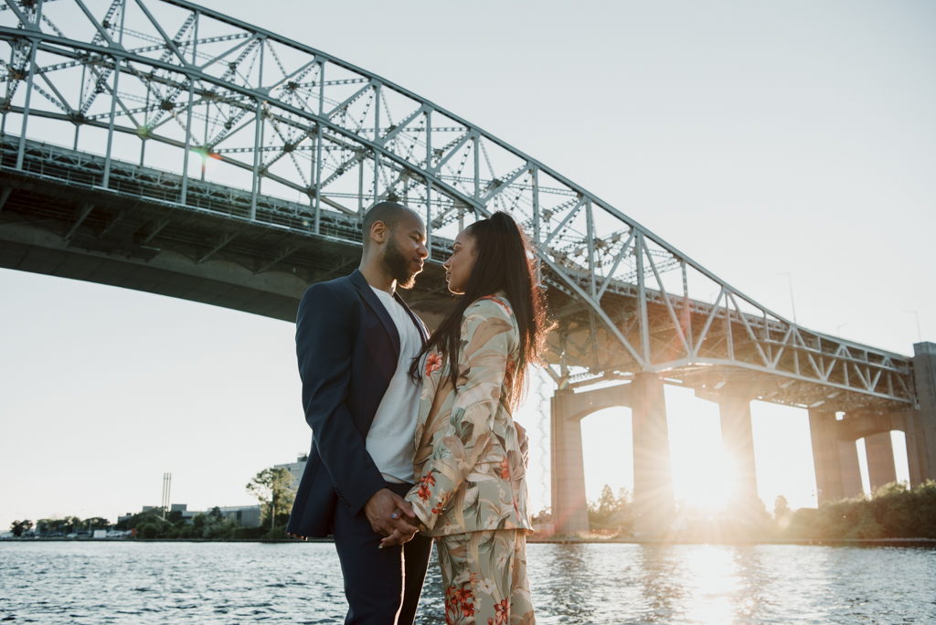 This shoot with Carolyn & Ross started in my dreams…all those long drives over the Burlington Skyway to visit my family over Niagara way…all those slow sunsets bathing the bridges and buildings in honey lights. So many times I’ve stopped to shoot a few frames and then longed for a subject to insert into the madness. When these two agreed to come along and stomp with me through the dust and puddles under bridges and highways, past smelly barges and headlong into an industrial landscape wearing their finest, I was like: these images that have lived in my head all this time better look as good on the outside.! And how lucky am I, given the trust and generosity of this couple, plus their super stylish and spirited way..? The late evening sun all out in it’s glory…and the sweet relief of a once-in-a-while breeze..and most crucial to the vibe of these pics, the deep soul-mate connection that lives within the hearts of these two beautiful people.