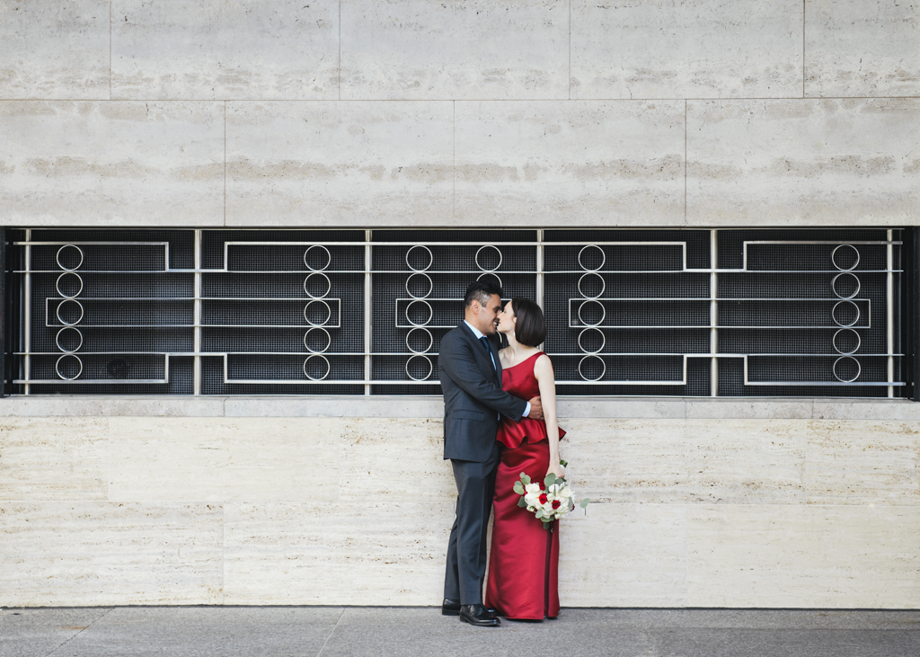 A classic shoot along Bay St. beginning with the hub of hustle at Union Station under peak sun! We occupied the mouths of banks and made mirrors of glass walls – studied symmetry in the details. Concrete, steel, glass and stone. Perfect raw materials to backdrop a red wedding dress. I just love that these scenes look like no one else was there – like we had the whole core to ourselves (wink wink).