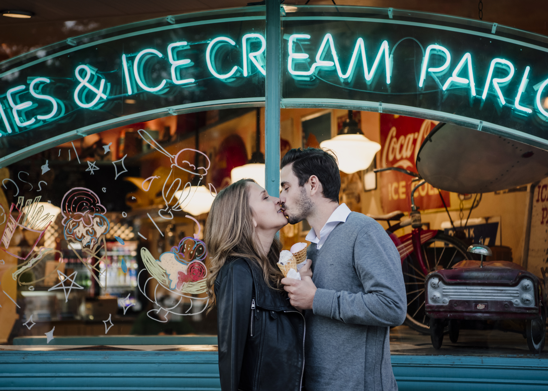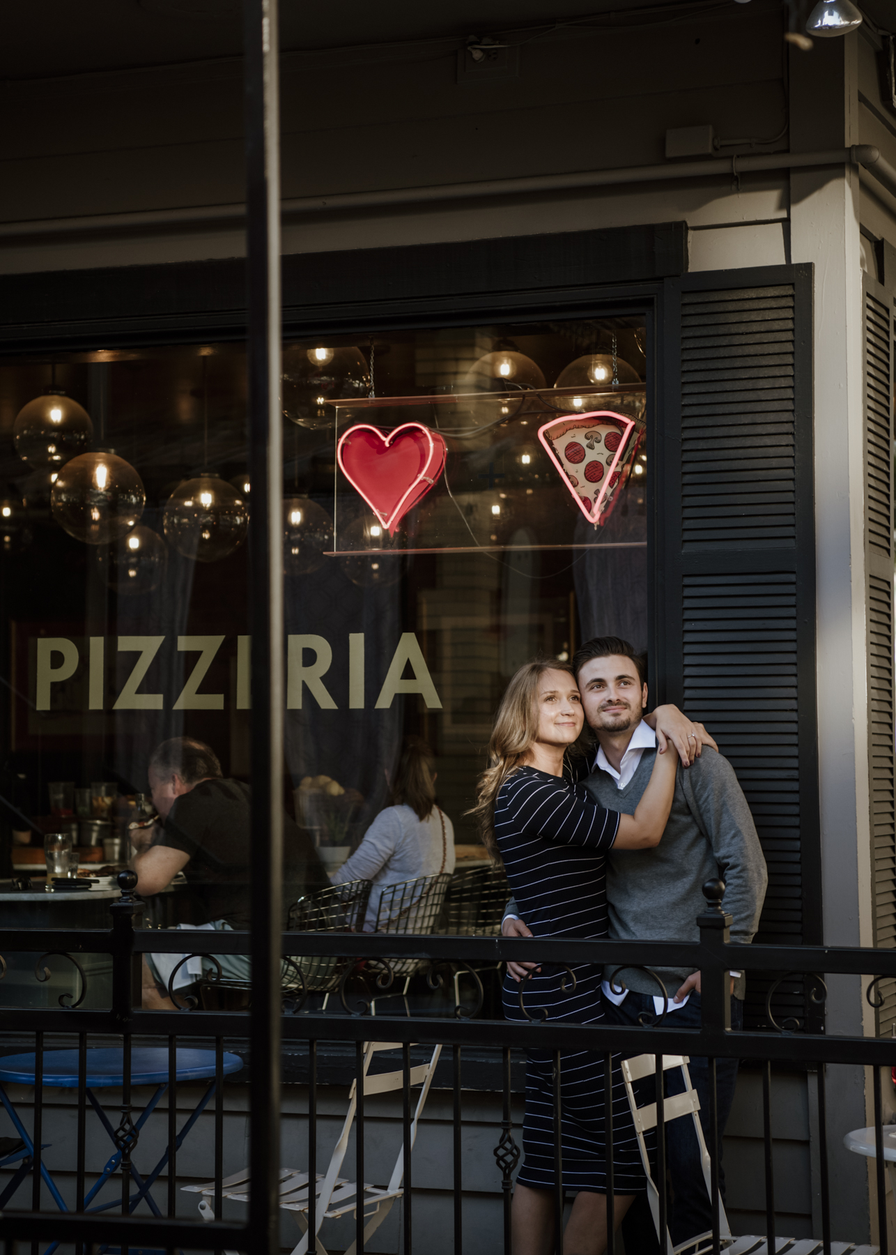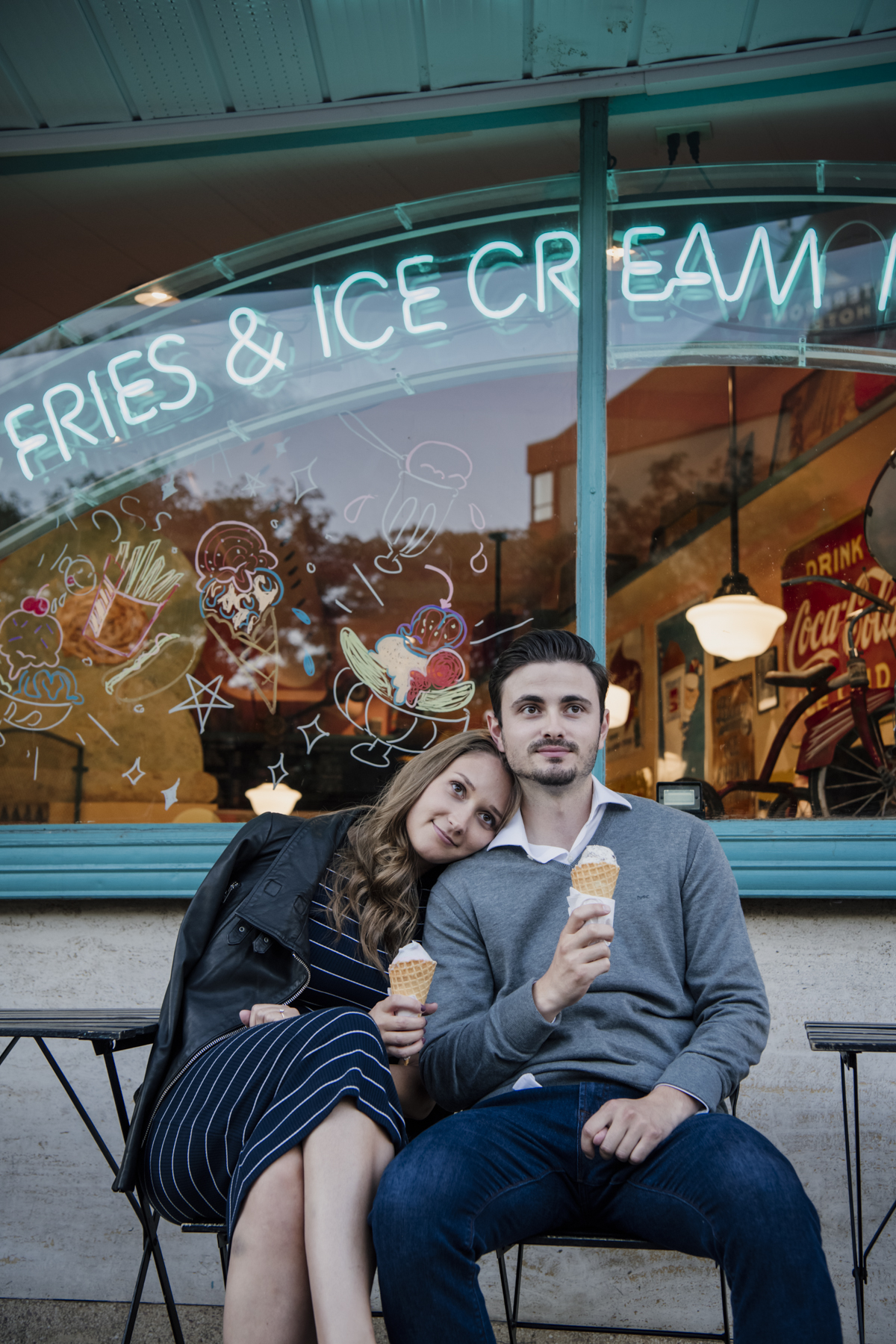 When coming up with a plan for an engagement shoot, I (obviously) want to take my cues from the couple. Where do they like to roam? What do they like to do together? Since this is the town where they live, and these are the places that they will likely return to again and again, why not make these the backdrop of their memories, past and future. I love how the play between history and the future is always popping up in the making of images. Will they return to this pizzeria on their 1st anniversary? Will they take their children to this ice cream joint, then take them home to show them this photo of their younger selves? It also doesn’t hurt that these two were brimming with the excitement and anticipation of their wedding day, right around the corner. Can you see the romance? I hope so. Way to rock a photo shoot Ivona & Niko. Your wedding pics are rolling in with winter. Stay tuned! xo