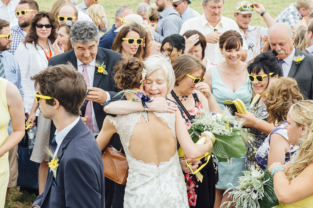 They live in Alberta, but decided it would be fun to throw a great big grassroots party on that same land where they decided to spend their lives together–or at least on the land underneath where they made that pact. Jacalyn’s dad truly spared no effort to make this happen: he cut paths through the trees, cleared the woods for the ceremony, laid a cement floor in the hangar to hold the reception, and then built a bridge to connect the two. He also built all those benches to make a natural church setting out of the tree covered clearing.